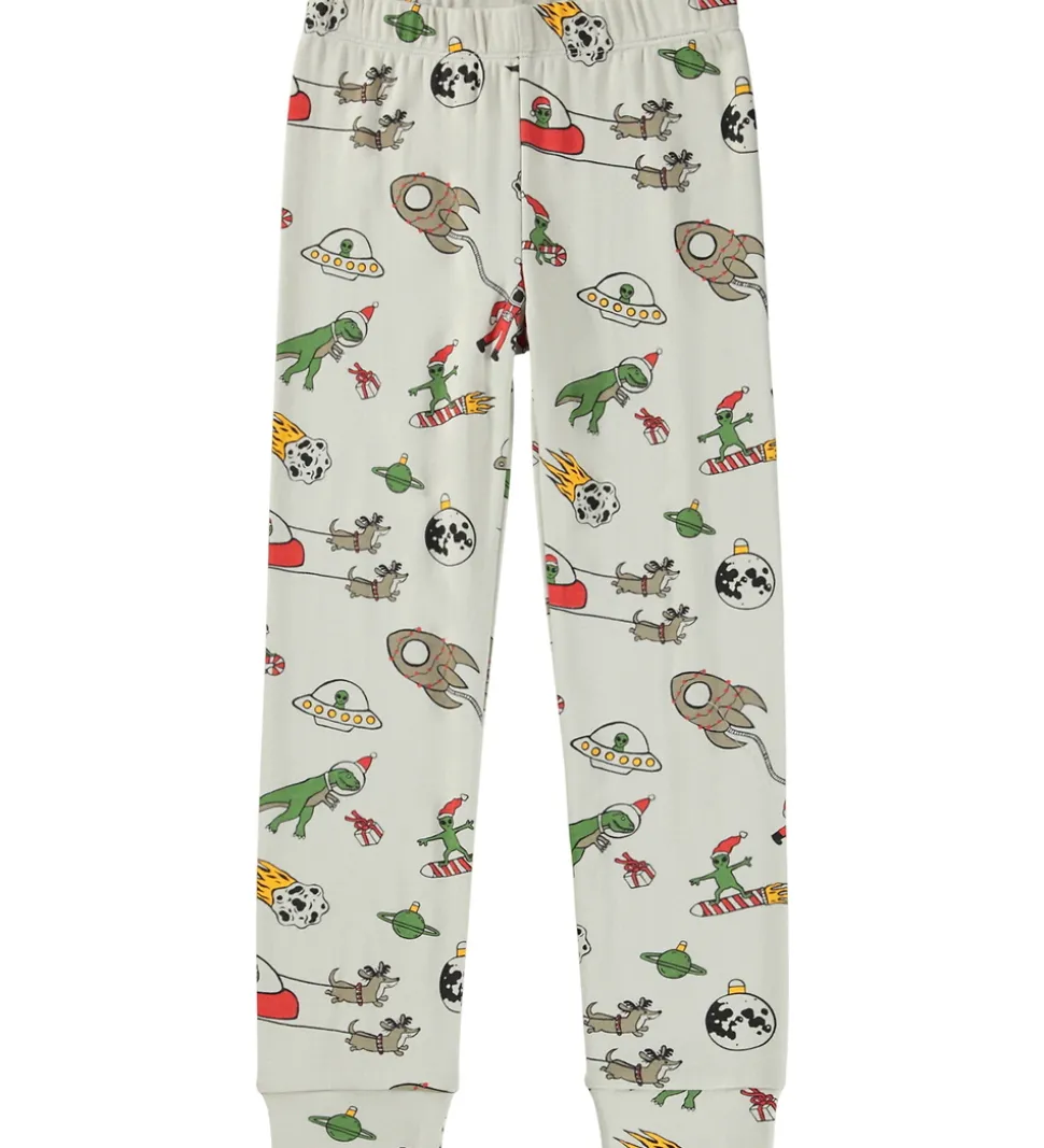 Smart Molo nattøj bestående af bluse og bukser i en lys beige nuance og med et kombineret jule- og ruminspireret print i form af bl.a. raketter, planeter, julekugler og rumvæsner med nissehue.