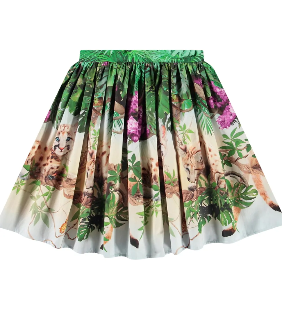 Flot Molo nederdel med et detaljeret print af skovmotiver og søde leoparder. Nederdelen har en bred kant i livet med elastik i ryggen, og skørtet har masser af vidde. Nederdelen består af et enkelt lag i en let, fastvævet kvalitet.