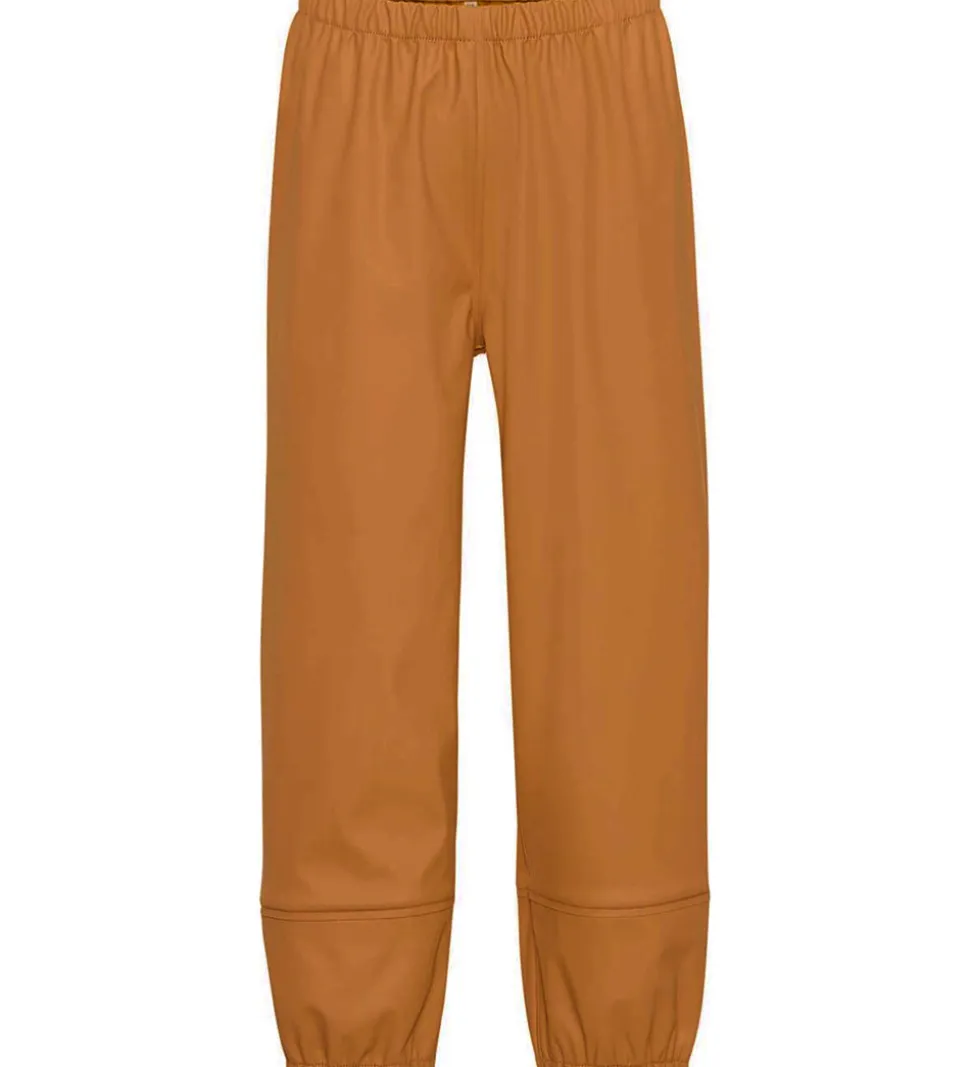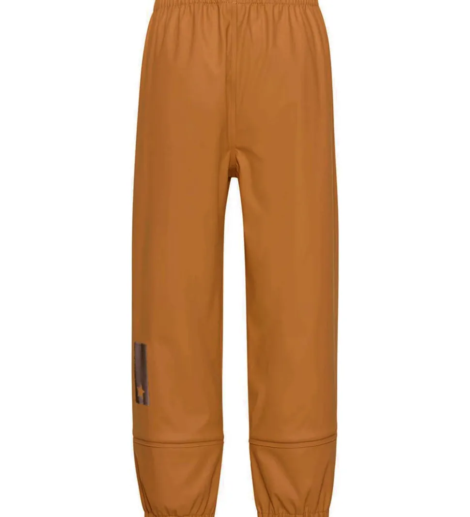 Flotte Molo regnbukser af PE i ensfarvet mandelbrun. Regnbukserne har også en praktisk logorefleks bag på højre ben.