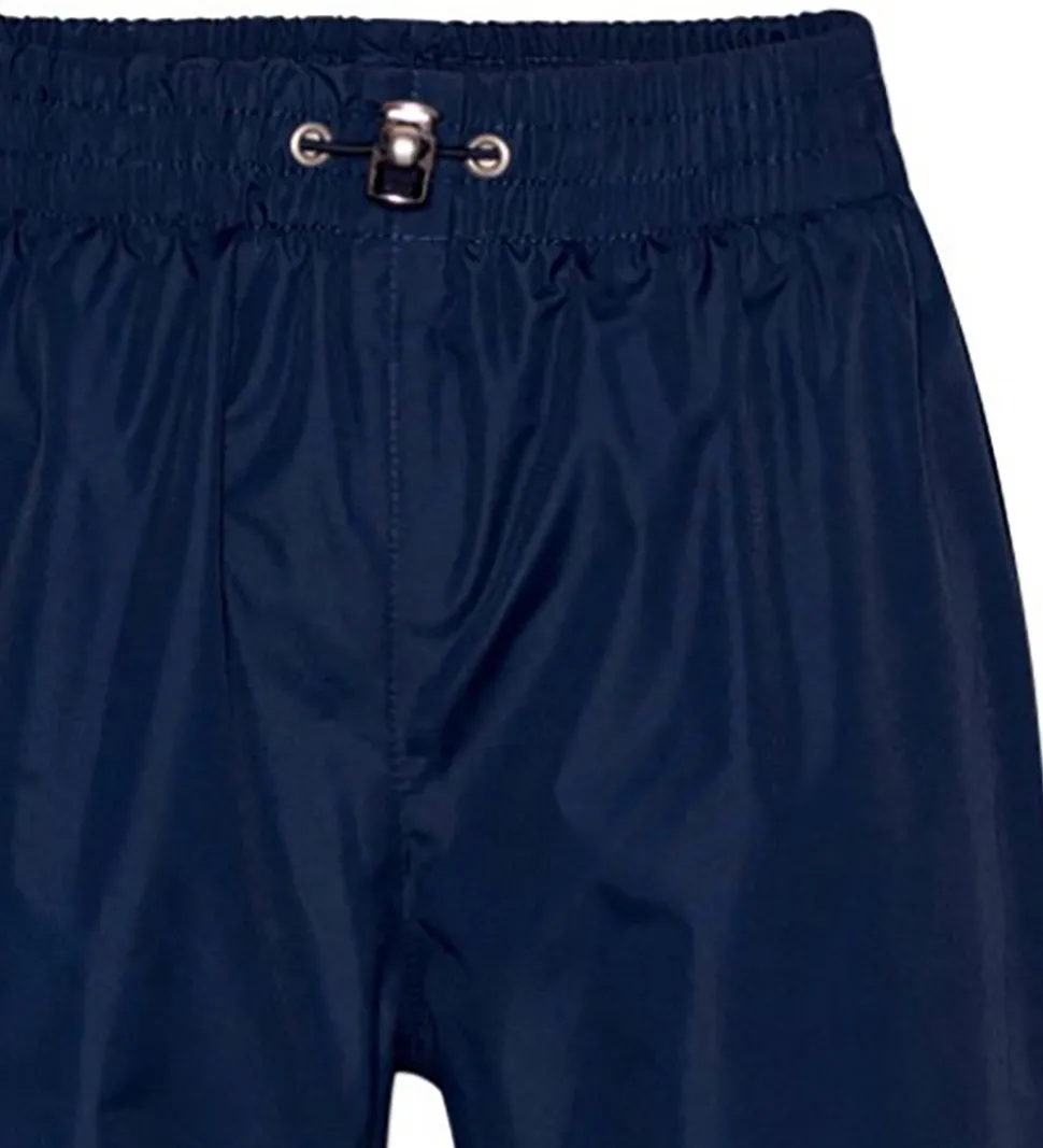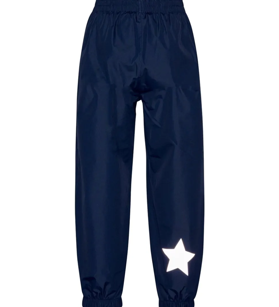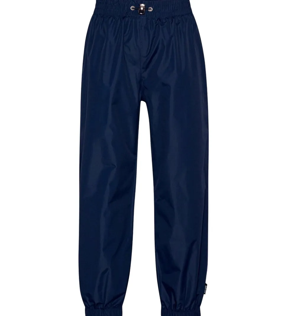 Flotte Molo regnbukser i ensfarvet navy PE og med en praktisk logorefleks bag på højre ben.