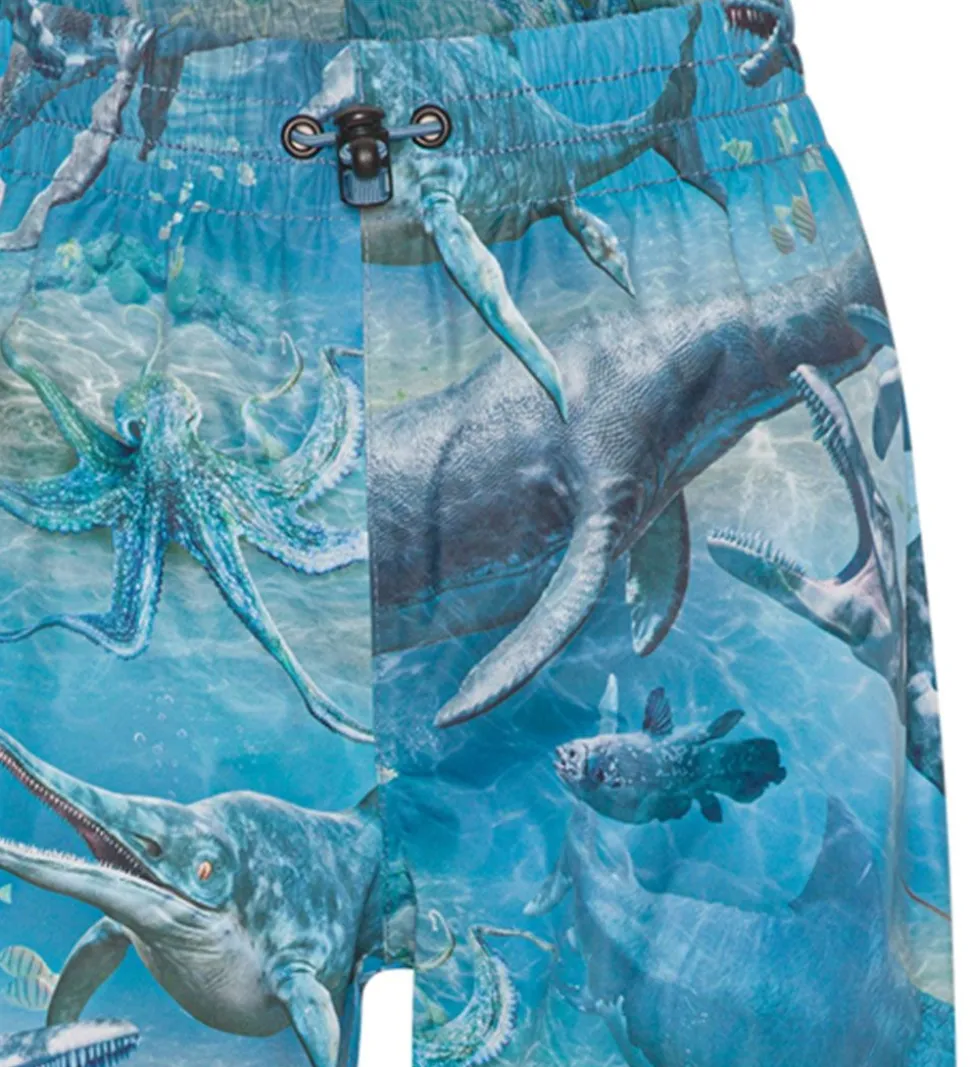 Seje Molo regnbukser i havblå med et alloverprint af skarptandede, forhistoriske havdyr. Regnbukserne er desuden udstyret med en stor, reflekterende Molo-stjerne bag på højre ben.