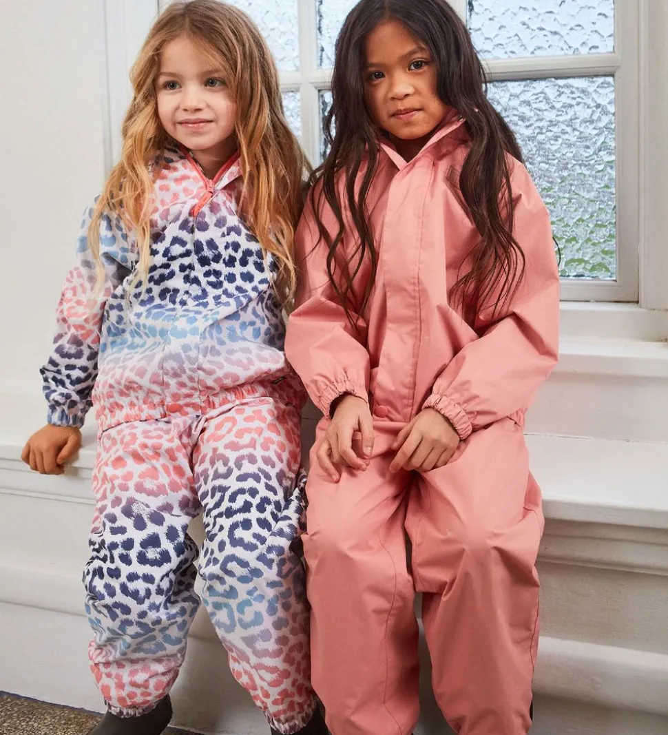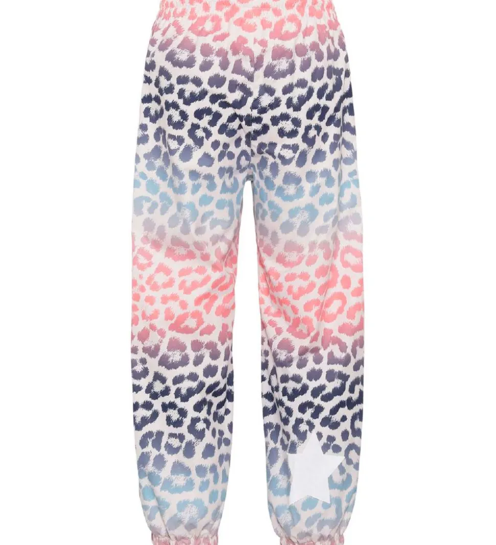 Seje Molo regnbukser i hvid med et allover leopardprint i rosa, lilla, sort og blå nuancer.