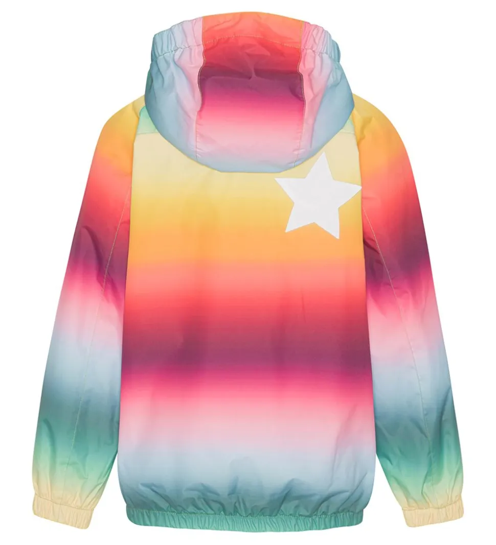 Sej Molo regnjakke i rosa, blå, gule og grønne farver samt med en gummi-logoapplikation på venstre bryst. Regnjakken er desuden udstyret med en stor, reflekterende Molo-stjerne på højre skulderblad.
