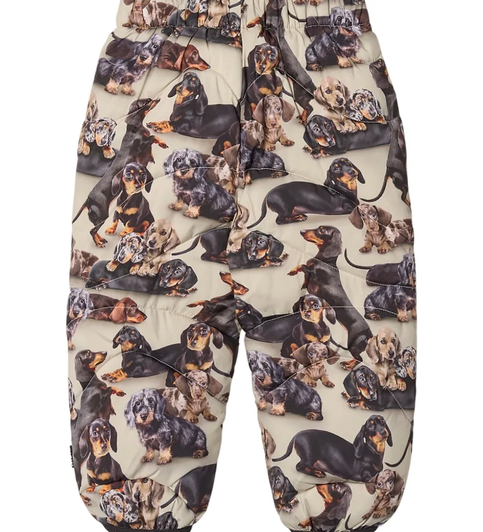 Dejlige Molo skibukser med et unikt print af forskellige hunde, der dækker hele overfladen. Skibukserne er i nuancer af beige med sorte, beige og brune detaljer og har bølgende syninger.