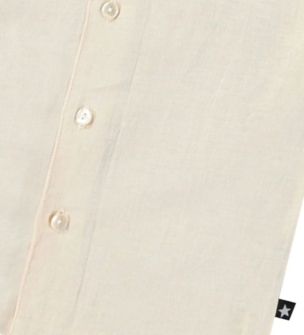 Skøn Molo skjorte med korte ærmer i en lys beige farve og med en diskret, broderet smiley på venstre bryst.