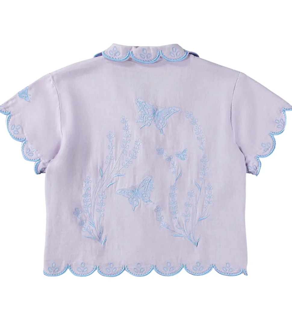 Fin Molo skjorte i en lys lilla nuance prydet med blå broderier af sommerfugle og planter. Skjorten har en klassisk krave og korte ærmer. Foran lukkes skjorten med gennemgående knapper. Skjorten har bølgede kanter ved alle åbninger.