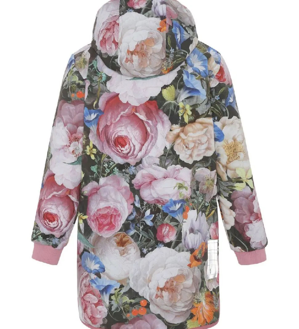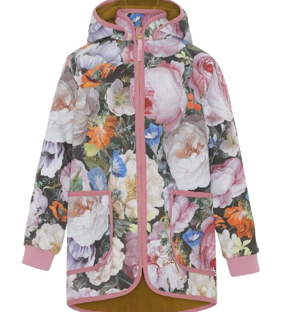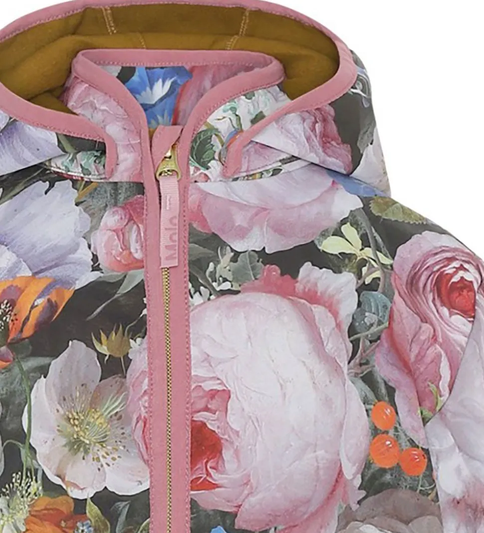 Lækker Molo softshelljakke i rosa med et yndigt allover-blomsterprint i rosa, hvide, grønne og gule nuancer.
