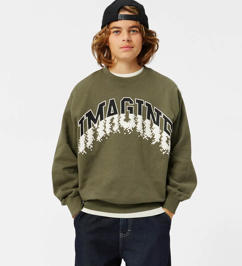 Smart Molo sweatshirt i en dyb olivengrøn farve med et iøjnefaldende “IMAGINE” print henover brystet. Molo sweatshirten har lange ærmer og en rund hals, hvilket giver en stilren og moderne struktur. På indersiden er der blødt børstet bomuld.
