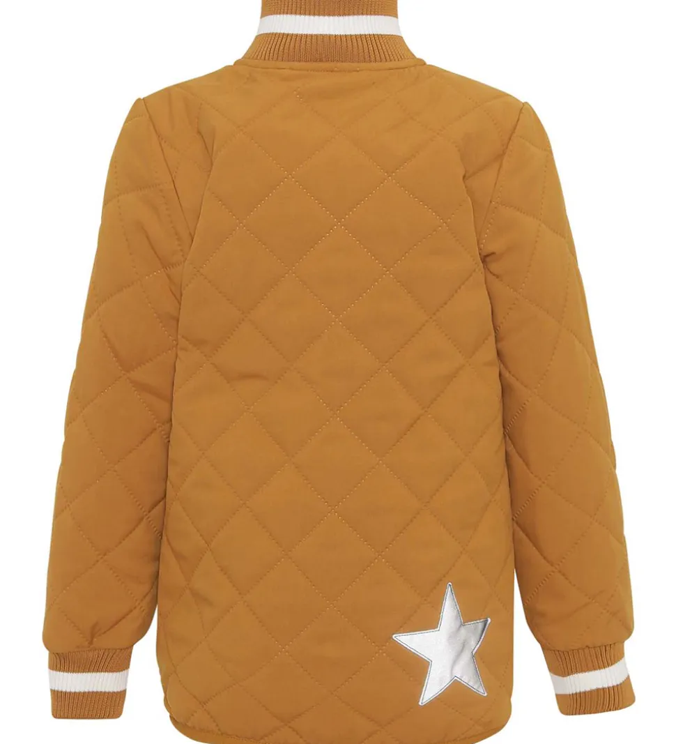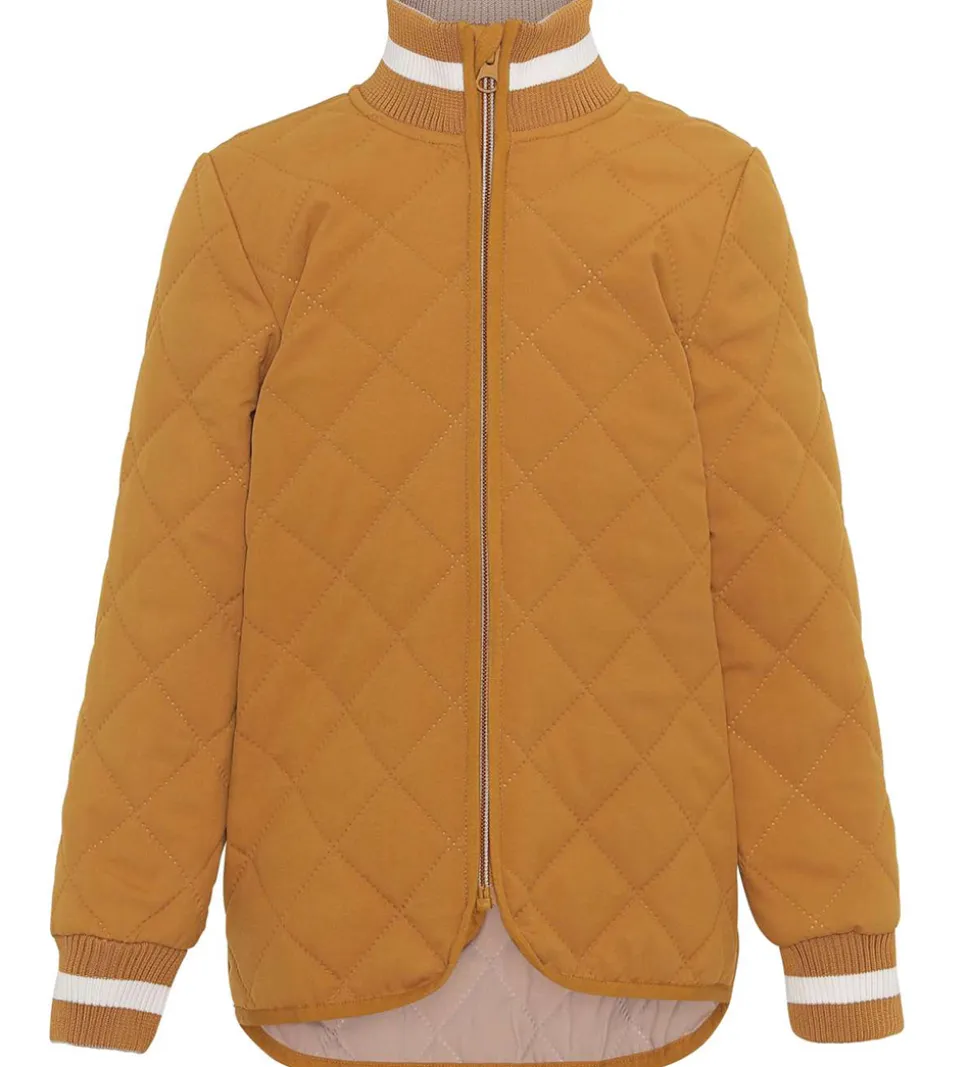 Dejlig Molo termojakke i gyldenbrun med et quiltet mønster og med hvide striber på ribkanterne. Indvendigt er der et rosa for.