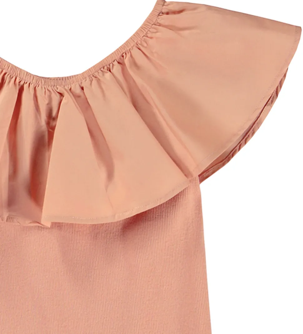 Molo toppen er i en fin ribstruktur og har ingen ærmer, men en bred flæsekant i halsåbningen, der også breder sig ud over skuldrene.