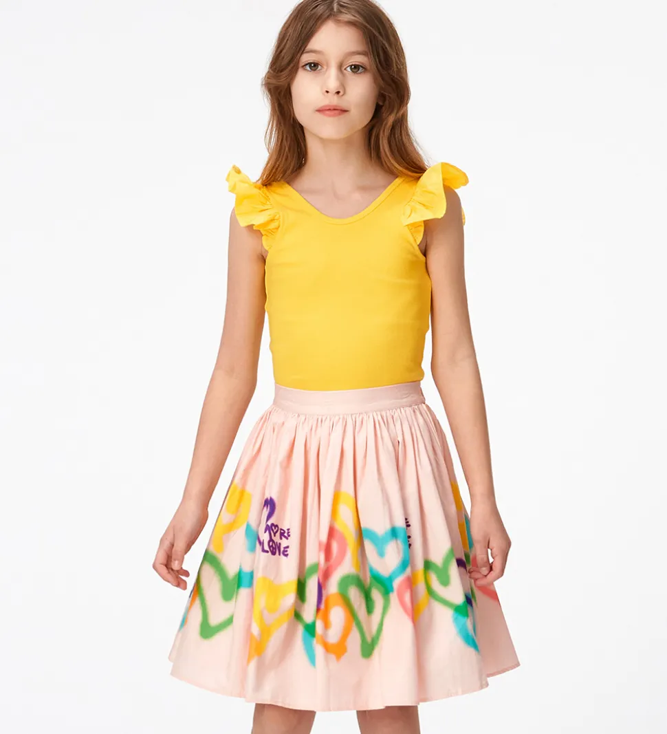 Molo toppen har brede skulderstropper med yndige store flæser, rund hals og dyb ryg. Toppen har smalle ribkanter ved hals- og armåbningerne. Toppen er lavet i en blød og behagelig bomuldskvalitet.