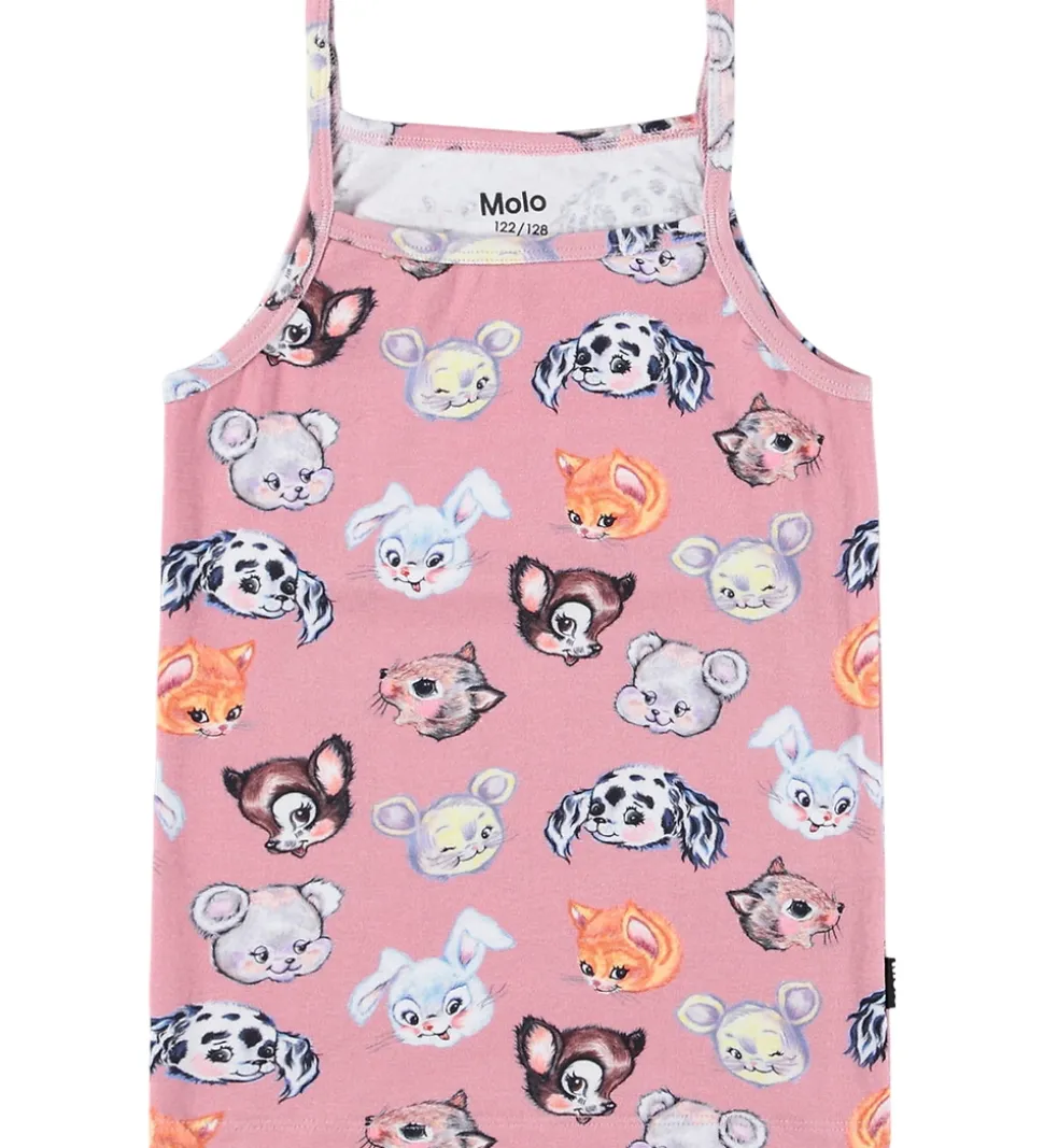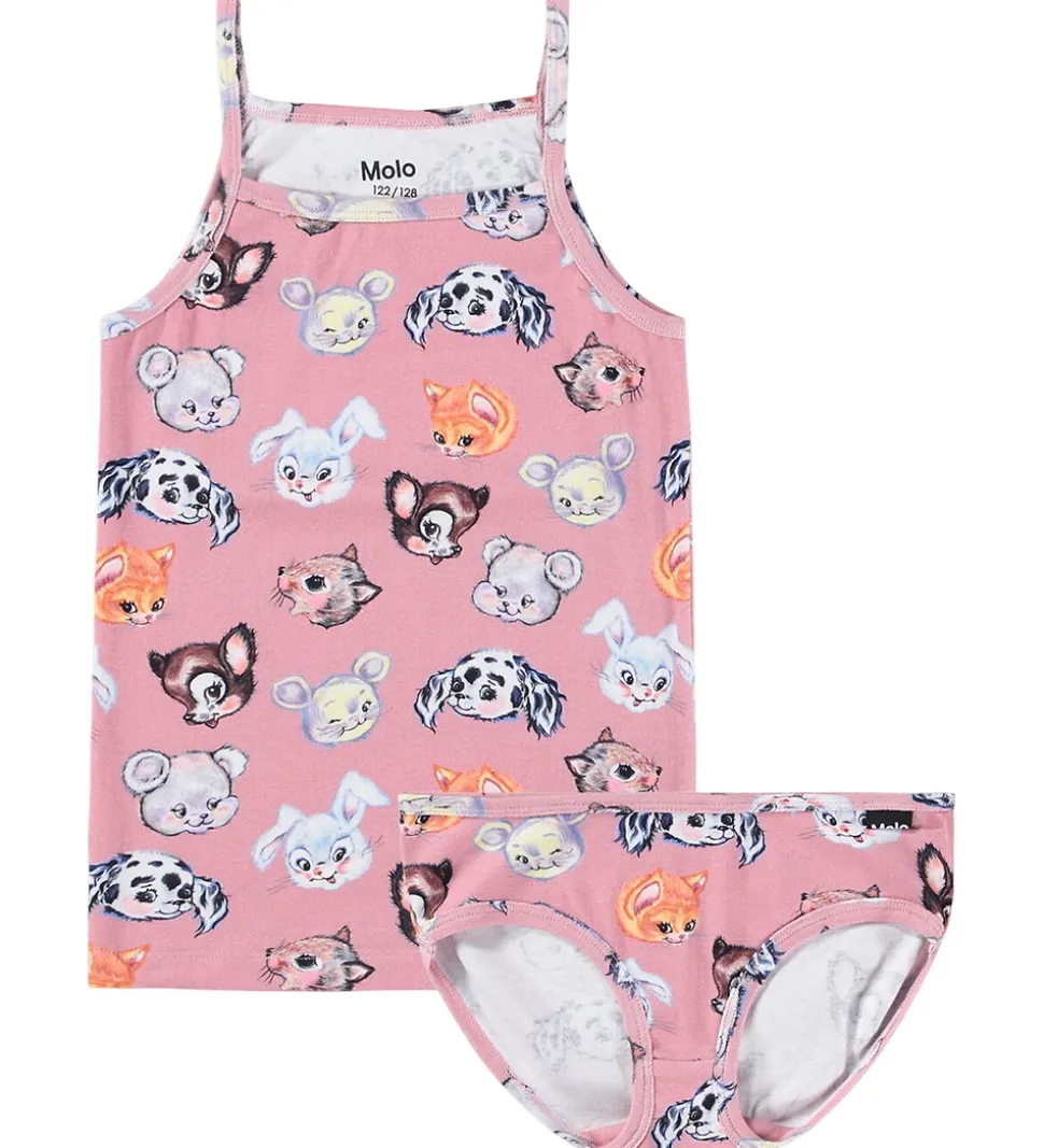 Charmerende Molo undertøj i en smuk rosa med sjove dyreansigter overalt. Molo undertøjet består af en top med tynde stropper og et par shorts, der skaber et sødt sæt.