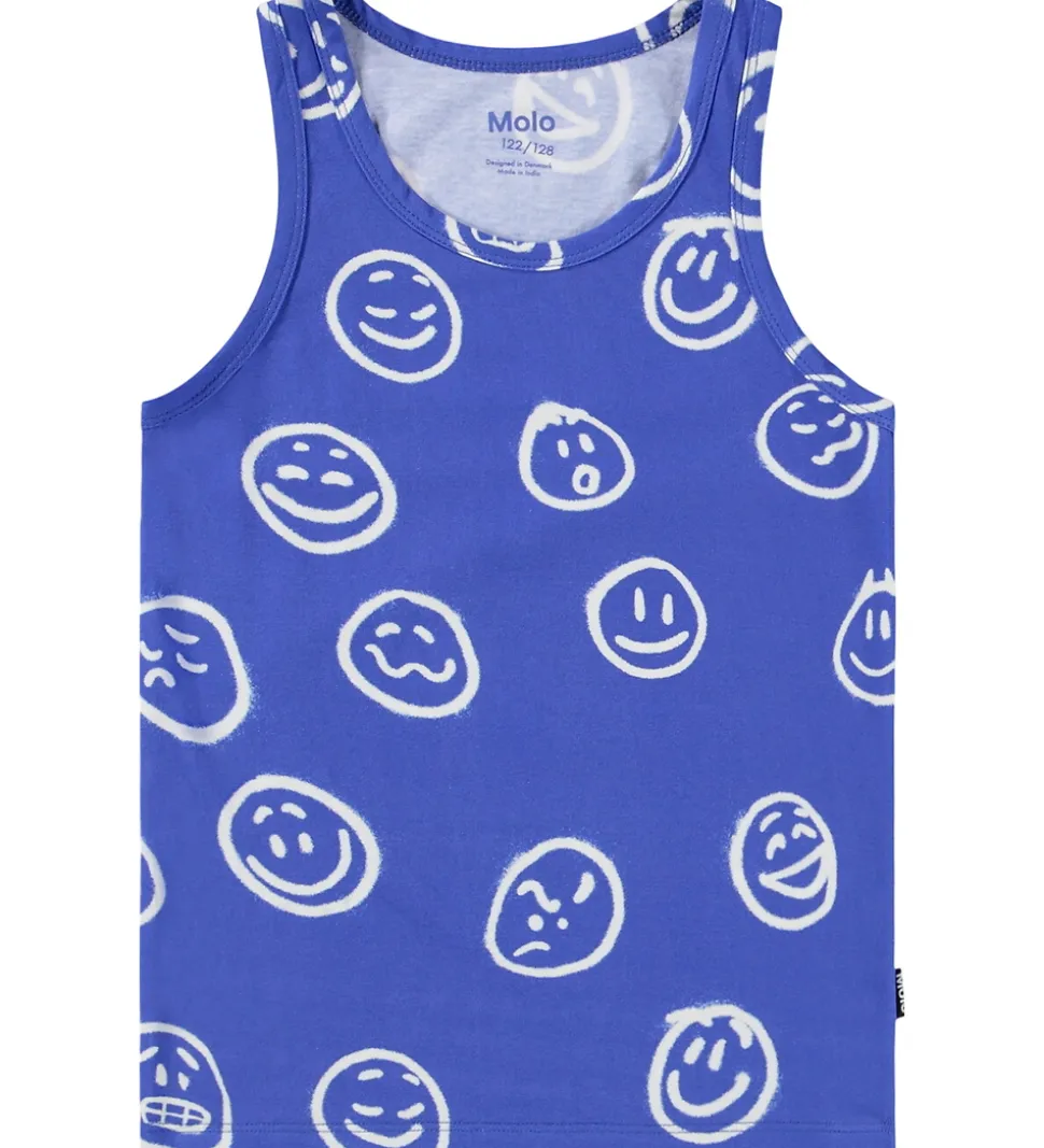 Stilfulde Molo undertrøjer i en 2-pak. Den ene undertrøje er ensfarvet blå, mens den anden har smilende ansigter i hvidt mønster på blå baggrund.