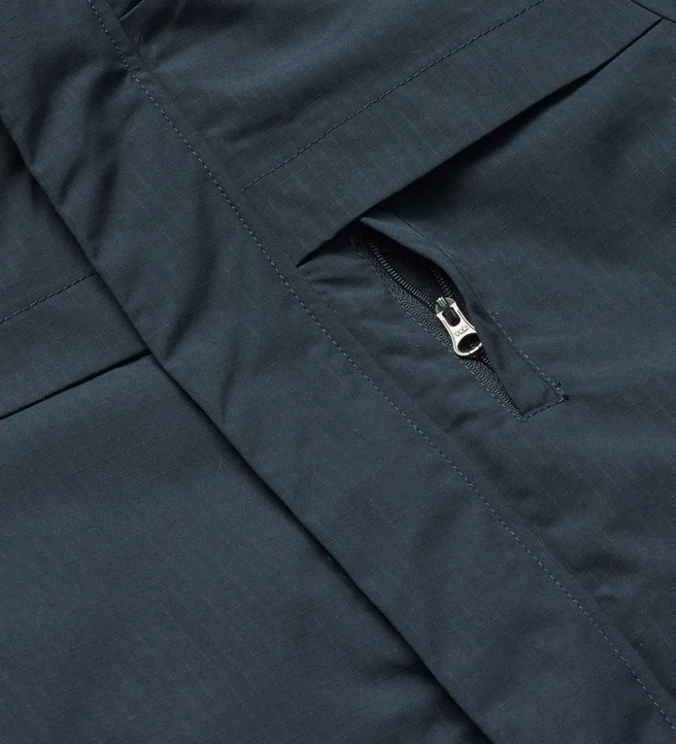 Vinterjakkens ærmer har snefang og brede ribkanter i åbningerne. På fronten har vinterjakken en foldedetalje på tværs af brystet og en brystlomme med vertikal lynlås i venstre side. Der er også to markante klaplommer på fronten, som lukkes med velcro. I livåbningen er der en smule high/low-effekt.