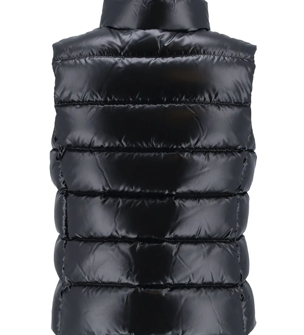 Lækker Moncler dunvest i ensfarvet sort, og fortil er der et filt-mærke med et Moncler-logo.