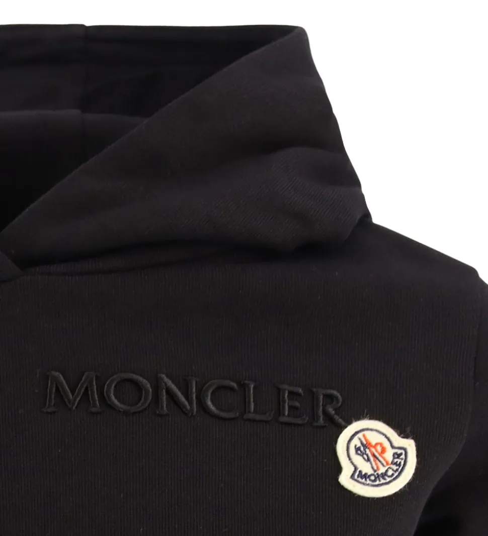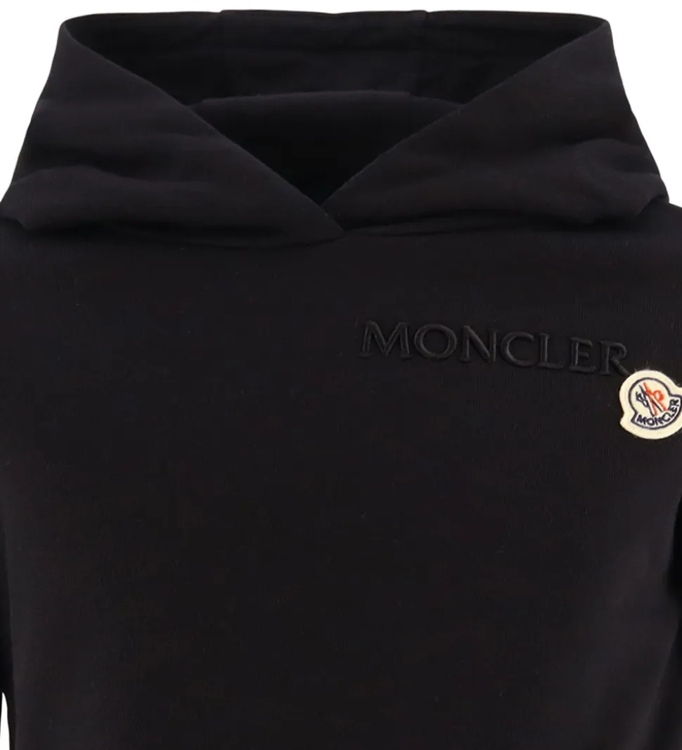 Elegant Moncler hættetrøje i klassisk sort med et diskret logo broderet på brystet. Moncler hættetrøjen har en praktisk hætte og lange ærmer. Designet er stilrent og uden mønster, mens den har ribkanter ved håndled og talje, hvilket giver en god pasform. Hættetrøjen har blødt, børstet bomuld på indersiden.