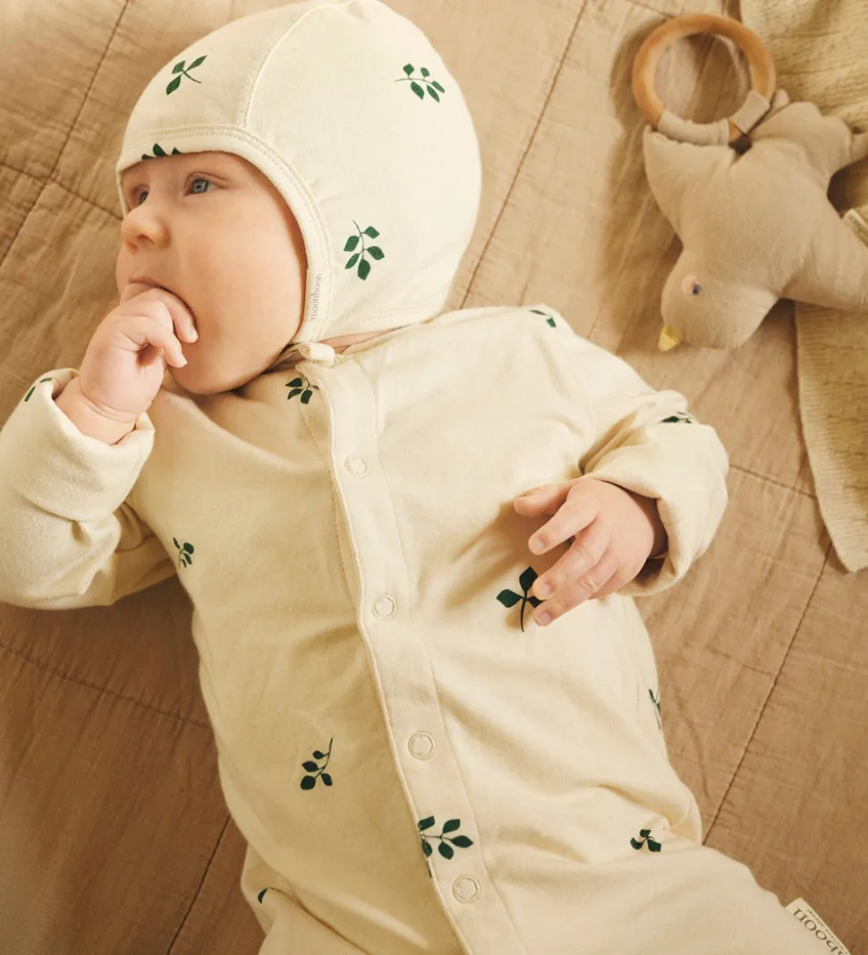 Både natdragten og babyhjelmen har trykknapslukninger og praktiske kanter, og der er smarte ombuk til faste hænder og fødder. Kvaliteten er blødt og strækbart, økologisk bomuld.