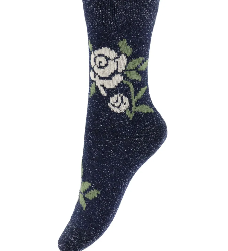 Skønne MP strømper i en smuk, mørkeblå farve med et flot blomstermønster i hvid og grøn, samt med glimmer. Strømperne har en fin ribkant øverst, der sikrer en god pasform. Den let glitrende effekt i stoffet giver et elegant udtryk.