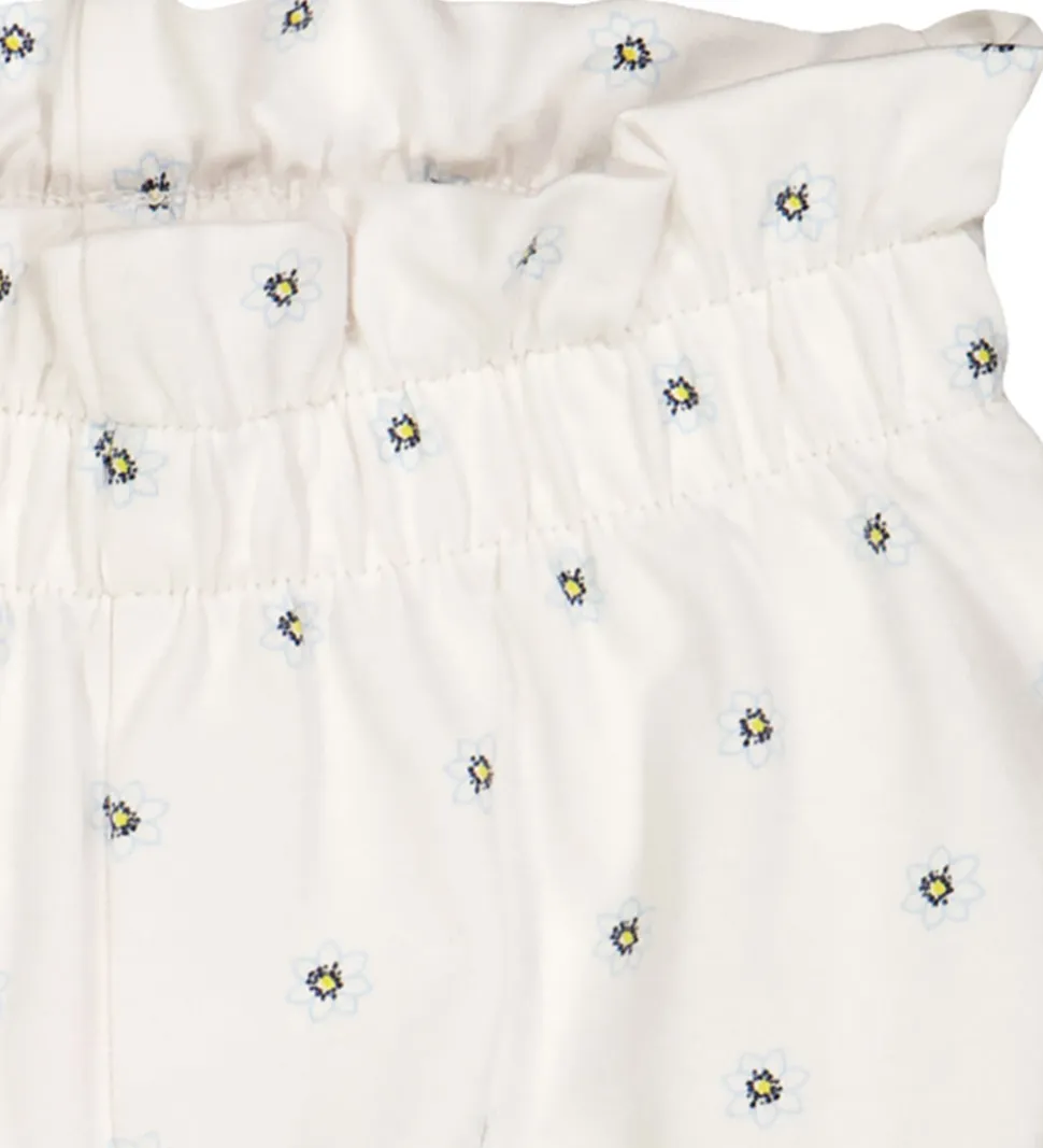 Behagelige Müsli bloomers i hvid med et fint blomsterprint i blå og gul. Müsli bloomersene har elastik i taljen og benene, hvilket giver en god og behagelig pasform.