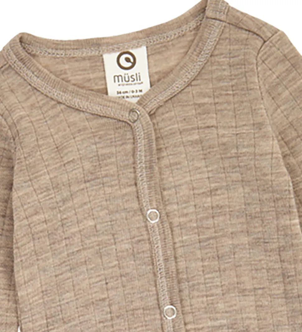 Fin Müsli heldragt i ensfarvet beige med ribstruktur. Müsli heldragten har lange ærmer og ben med praktiske ombuk, og den åbnes med trykknapper hele vejen ned ad fronten og ned ad højre bukseben indtil kanten. Heldragten er lavet af blødt, økologisk merinould i en let kvalitet.