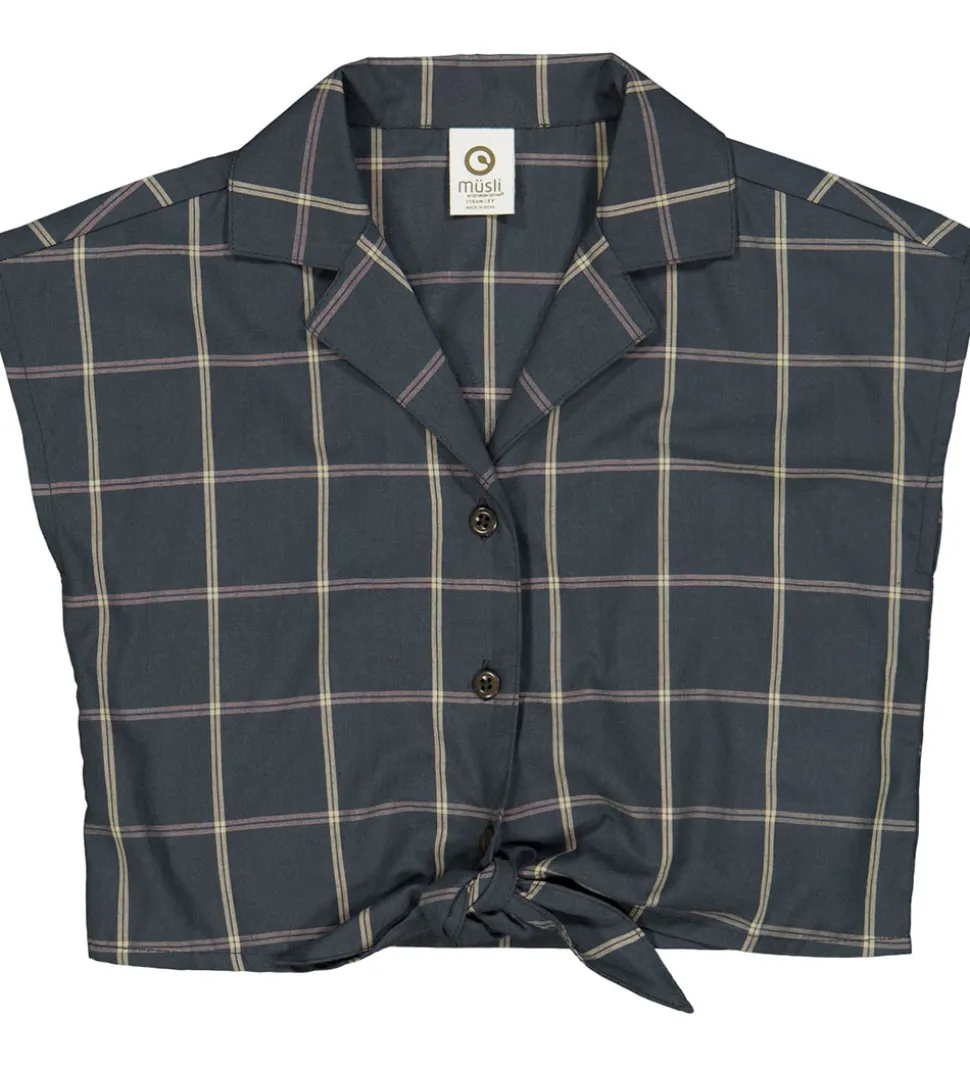 Smart Müsli skjorte i mørkeblå med ternet mønster. Skjorten er uden ærmer og har en flot krave og knaplukning fortil. Skjorten er en kort model med bindebånd nederst.