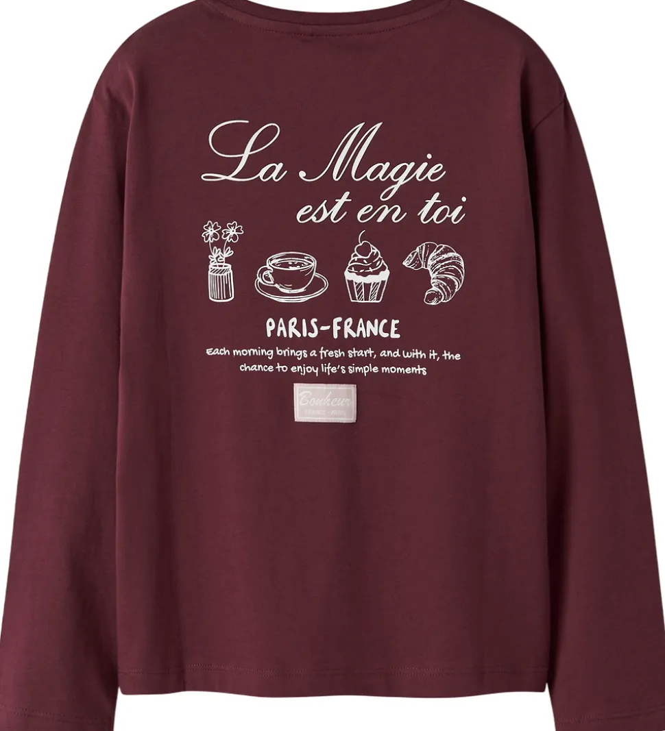 Elegant Name It bluse i mørkerød med teksprint i hvid på fronten. På ryggen er der et stort print med tekst og motiver med fransk tema. Name It blusen har en rund halsudskæring med en smal ribkant og lange ærmer.