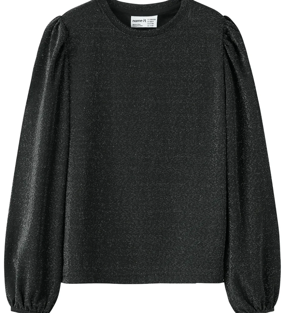 Stilfuld Name It bluse i en sort farve med glitrende detaljer, der tilfører et elegant touch. Blusen har en rund halsudskæring og lange ærmer med lette rynker ved skuldrene. Det enkle design gør denne bluse fra Name It velegnet til mange forskellige anledninger.