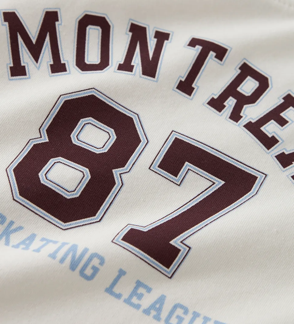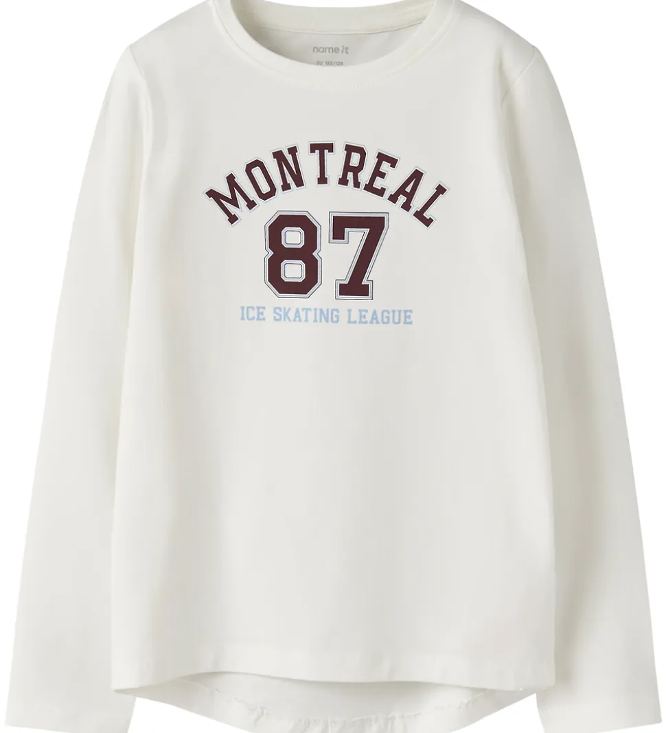 Smart Name It bluse i råhvid med tekstprint på fronten i bordeauxrød og lyseblå. Blusen har en rund halsudskæring med en smal ribkant og lange ærmer.