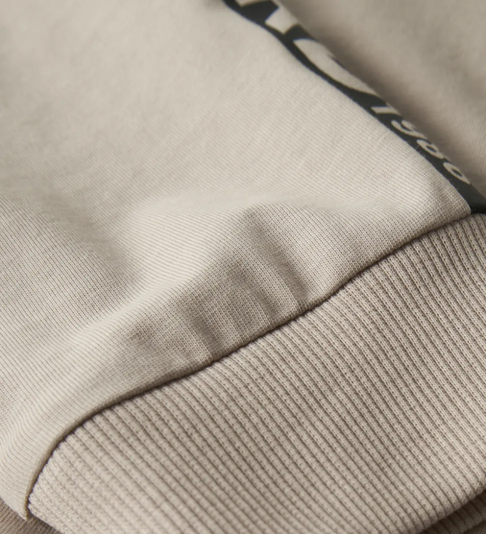 Smart Name It bluse i beige med teksten “Street Vibes” på fronten. På ærmet står teksten “Try Hard”. Blusen har en rund halsudskæring og lange ærmer med ribkanter.