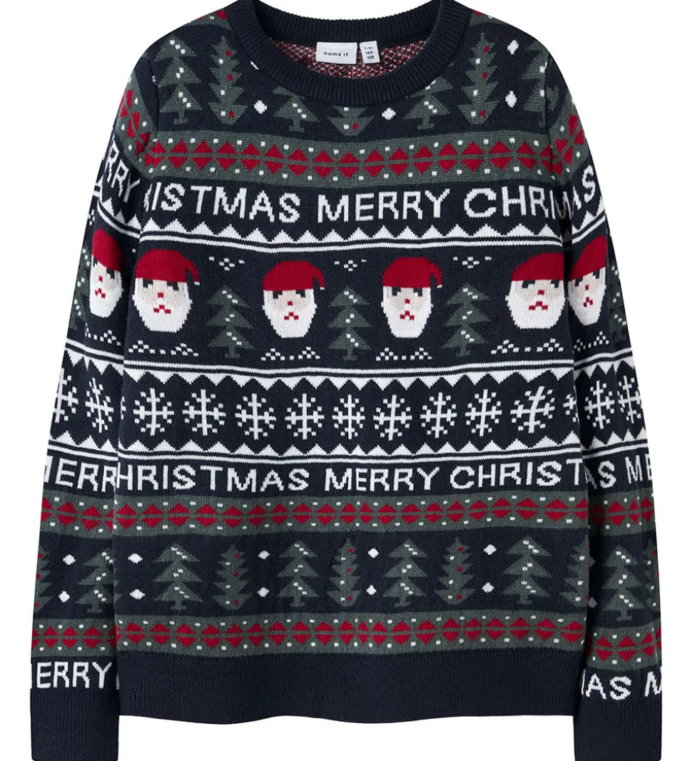 Festlig Name It bluse, hvor designet fanger øjet med sit julemotiv. Blusen er navy med et allover mønster, der inkluderer nisseansigter, juletræer, snefnug og teksten “Merry Christmas”. Den har en klassisk rund halsudskæring og ribkanter ved ærmerne.