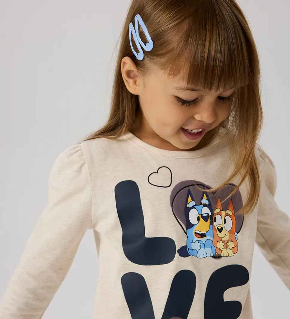 Designet indeholder et stort print med teksten “LOVE”, som er prydet med figurerne Bluey og Bingo. Blusen har en rund halsudskæring og diskrete detaljer, der understreger det enkle udtryk. Name It skaber her et stilrent og moderne udtryk.