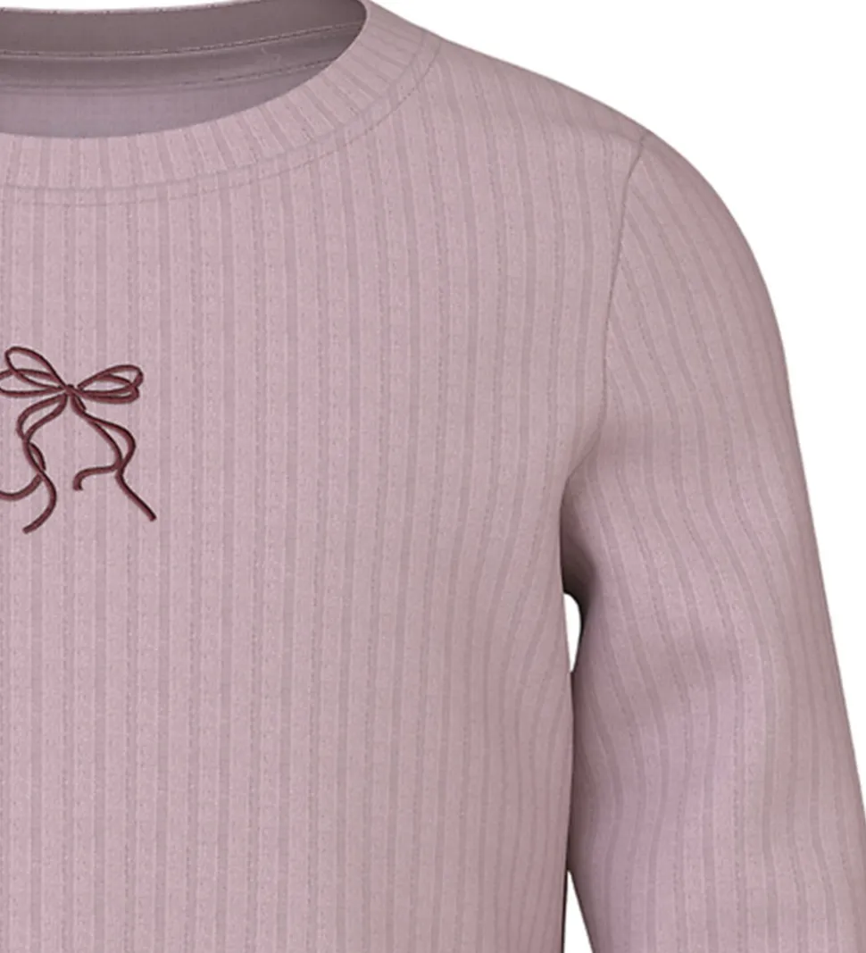 Fin Name It bluse i lys lilla med en lille, broderet sløjfe i rød glimmer på brystet. Blusen har ribstruktur og lange ærmer. I ærme- og taljeåbning er der bølgede kanter, som giver et fint udtryk.