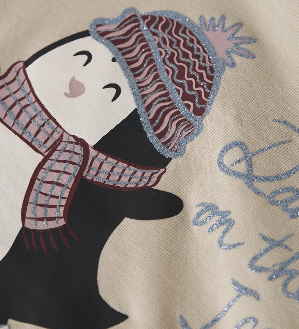 Charmerende Name It bluse med lange ærmer i en lys beige nuance. Blusen har et print af en glad pingvin på skøjter iført hue og halstørklæde. Ved siden af pingvinen står teksten “Dancing on the Ice” i blåt glimmer. Blusen har en rund halsudskæring med en smal ribkant.