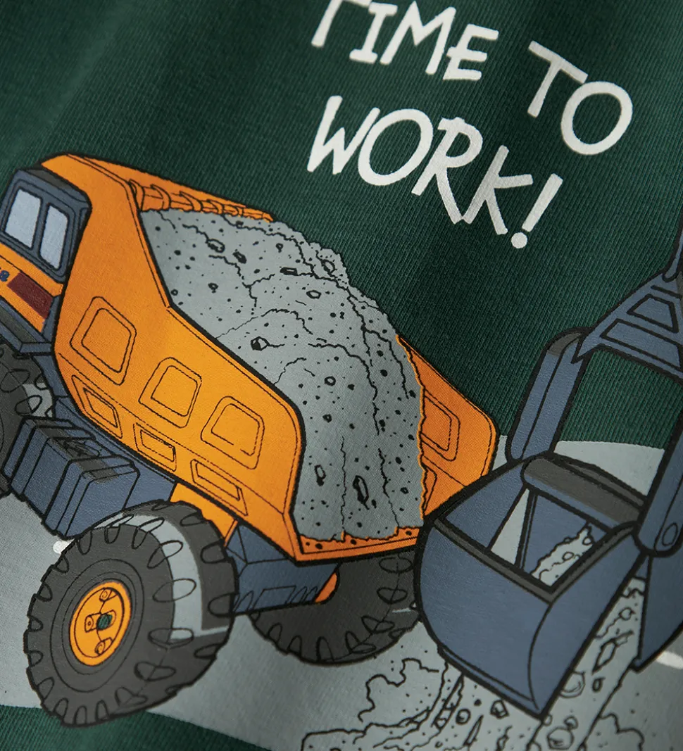 Smart Name It bluse med lange ærmer i en mørkegrøn nuance. Blusen har print på fronten og bagsiden af arbejdsmaskiner og tekstprint. Blusen har en rund halsudskæring for et klassisk look.