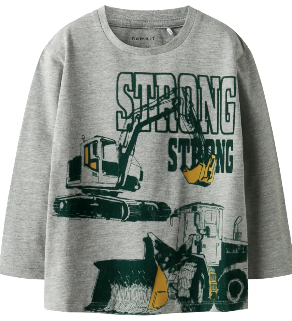 Flot Name It bluse med lange ærmer i gråmeleret. Blusen har en rund halsudskæring og et print foran med store maskiner og teksten “Strong” i mørkegrøn.