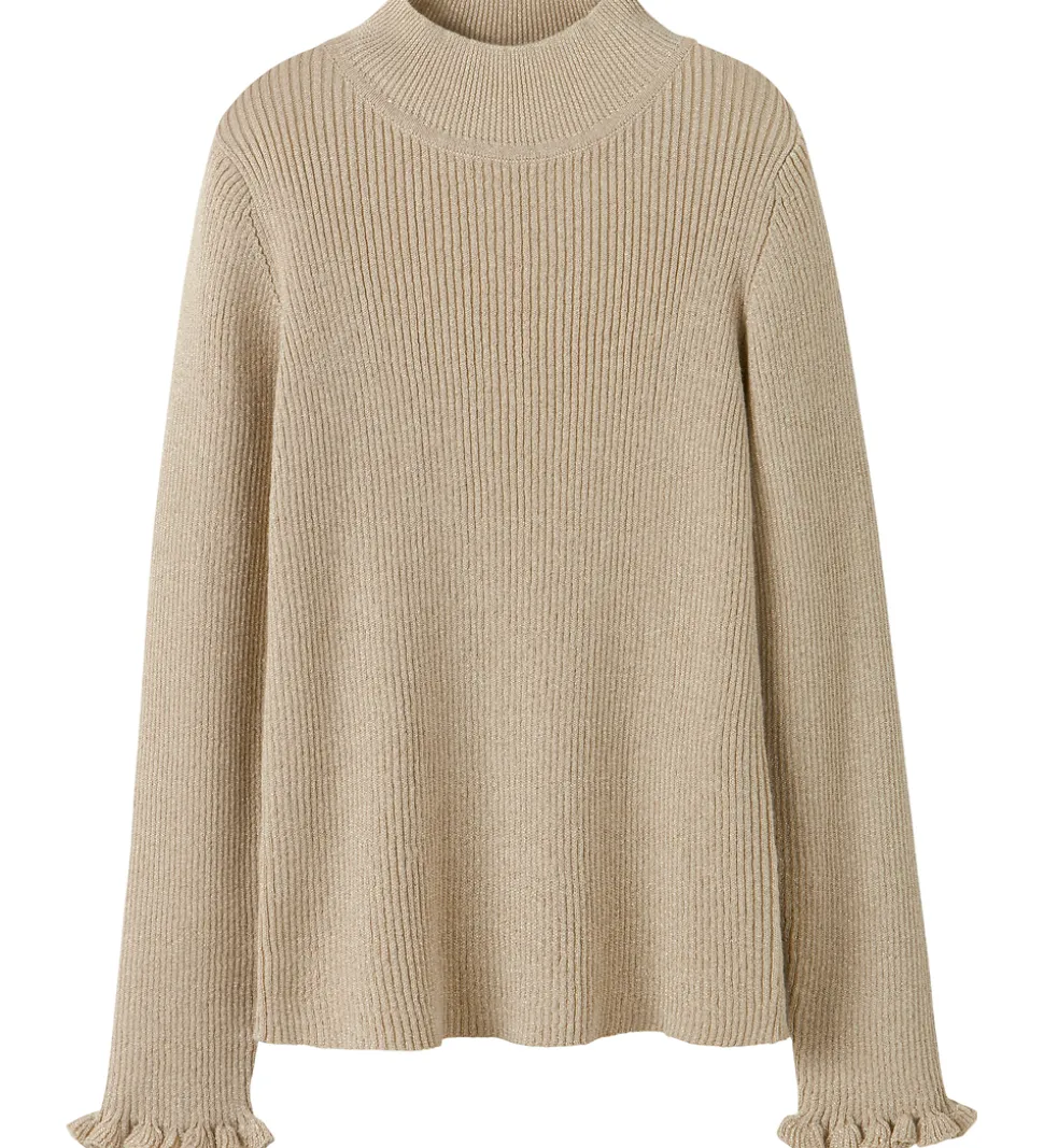 Blusen har en ribstrikket struktur, der skaber et enkelt udseende. Kraven er rund og tætsiddende, hvilket giver et tidløst design. Ærmerne er lange med fine flæsedetaljer ved enderne, hvilket tilføjer en diskret dekoration.