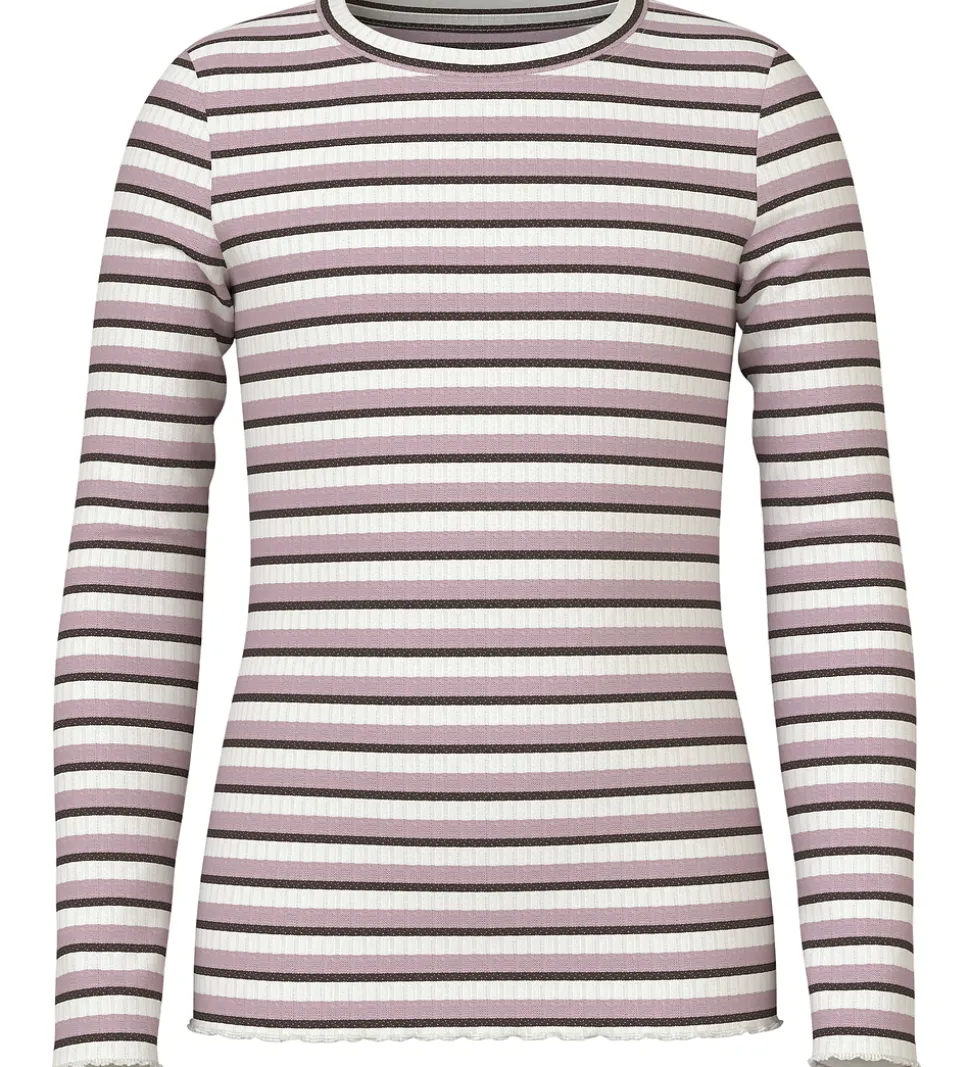 Smart Name It bluse med stribet design i hvid, rosa og mørekbrun med guld glimmer. Blusen har ribstruktur og en rund halsudskæring. Den har lange ærmer og bølgede kanter i ærme- og taljeåbning.