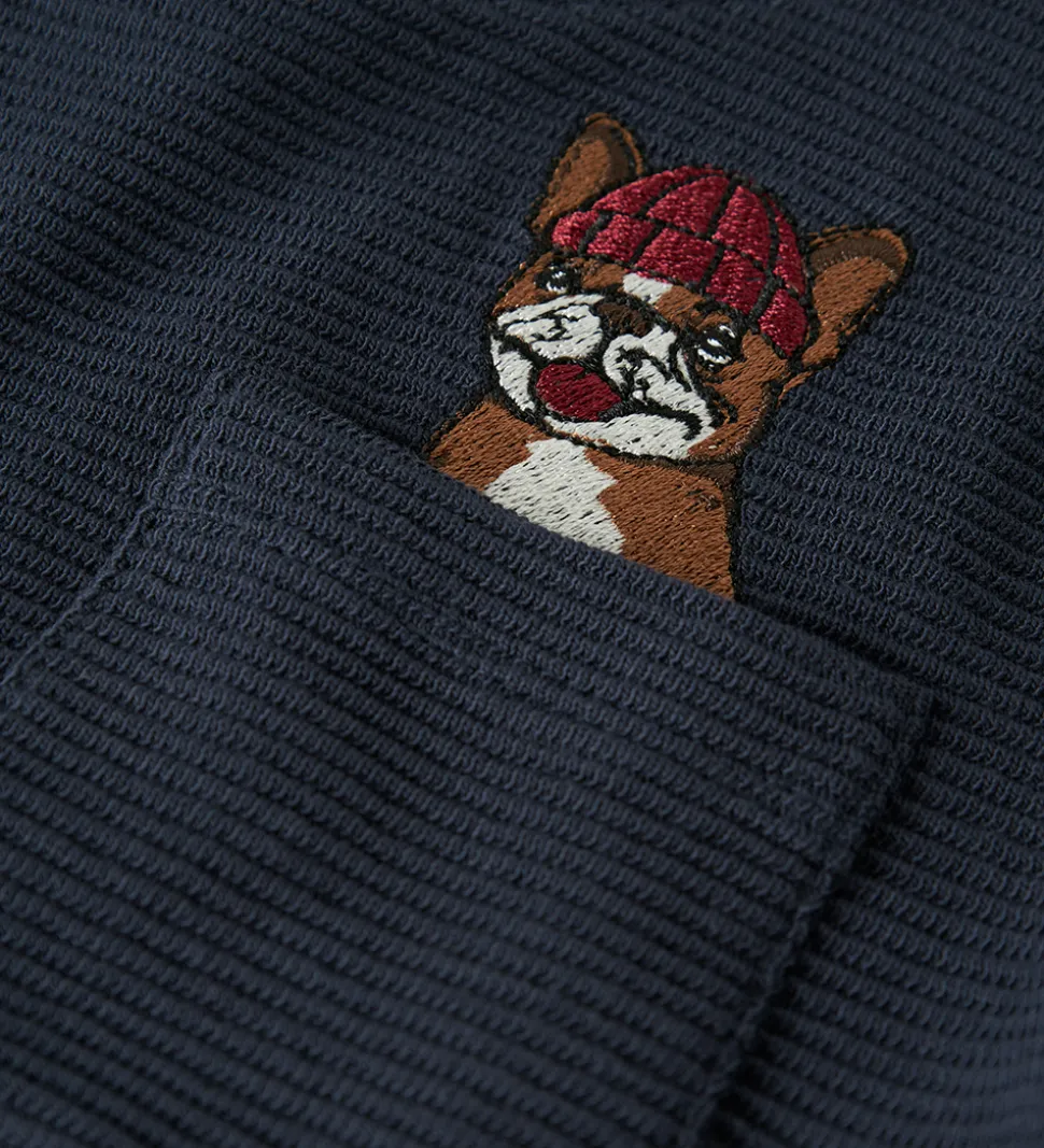 Smart Name It bluse i navylå med vandret ribstruktur. Blusen har lange ærmer samt en rund halsudskæring. På brystet findes en lille lomme og en broderet detalje af en hund iført hat, som tilføjer et sjovt og sødt element til det stilrene design.