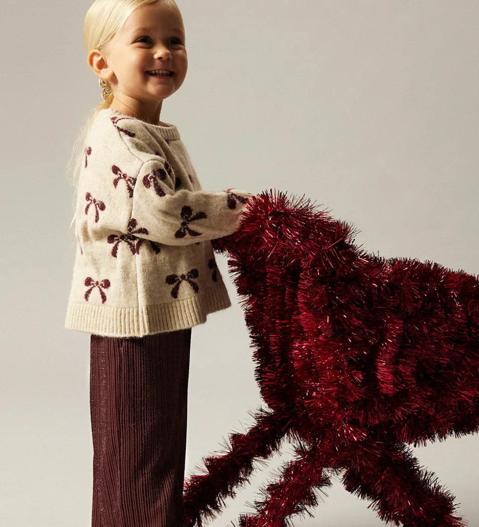 Flot Name It bluse med lange ærmer i en blød, beige nuance med et smukt allovermønster af mørkerøde glimmer-sløjfer.