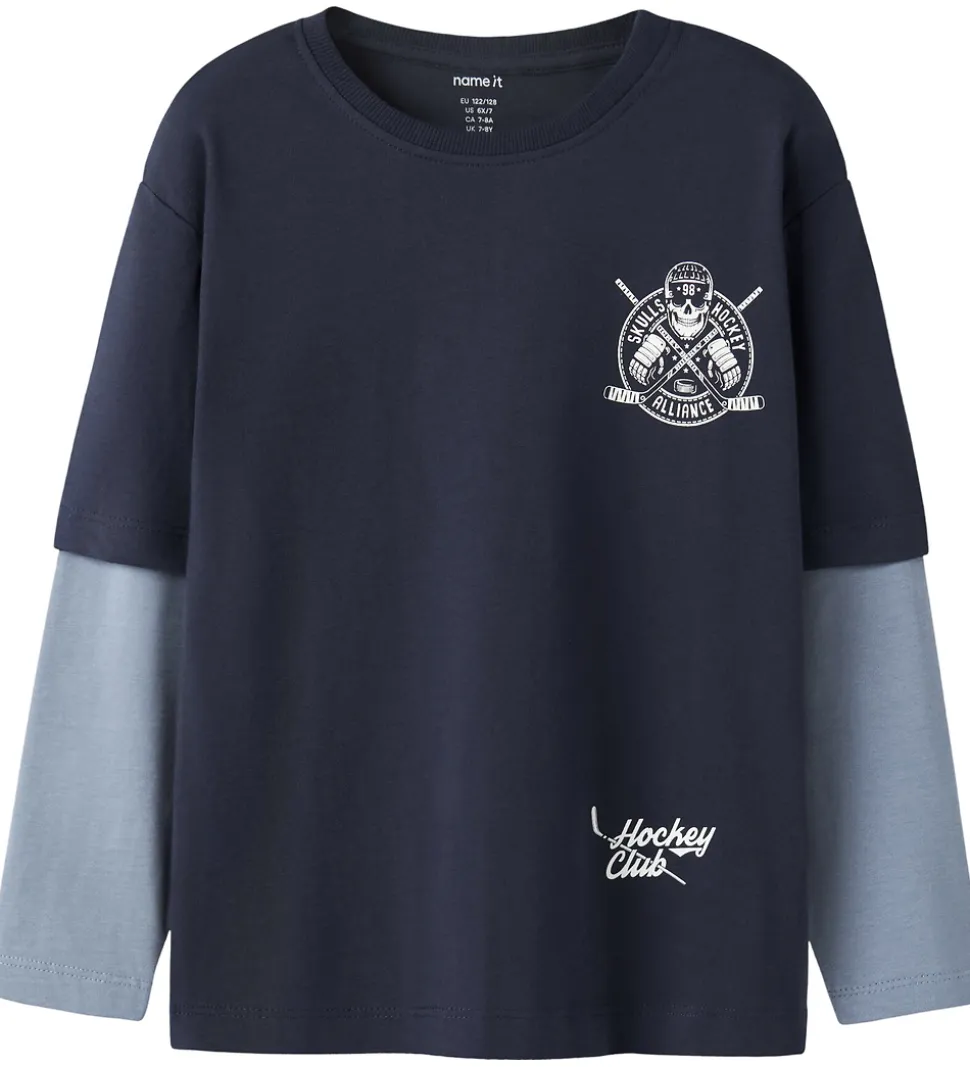 En bluse kommer i mørkegrøn med “SK8” og skateboard tryk på brystet, kombineret med lange hvide ærmer. Den anden bluse er dyb marineblå med et hvidt hockey-inspireret print samt lyseblå lange ærmer. Begge bluser har en rund halsudskæring.