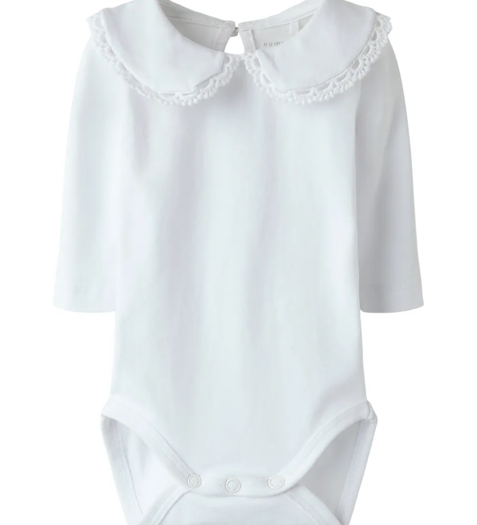 Elegant Name It body i en ren hvid farve. Bodyen har lange ærmer og en fin krave med dekorative blondekanter. Bodyen åbnes med en knap i nakken og trykknapper i bunden, der gør den nem at få af og på.