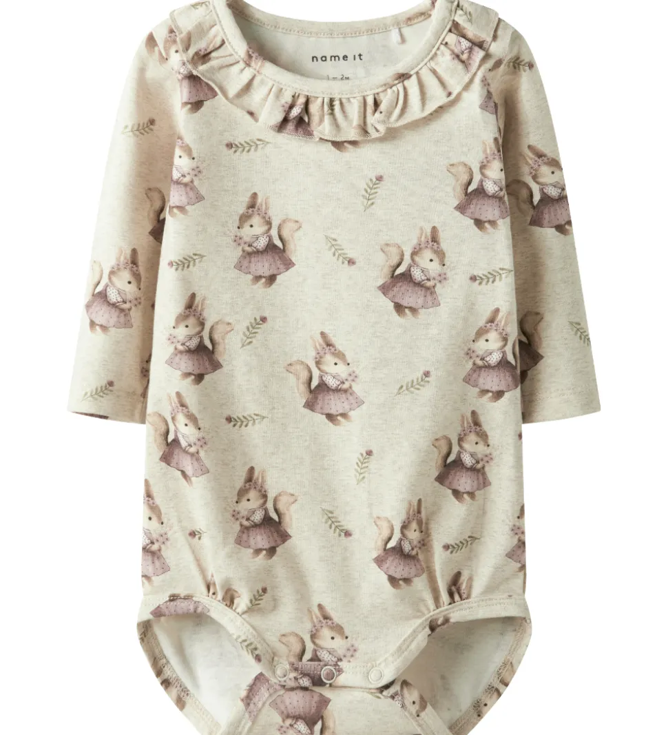 Charmerende Name It body i meleret beige med et yndigt print af små egern iført kjoler. Bodyen har en rund halsudskæring med en sød flæsedetalje og lukkes med trykknapper ved venstre skulder og mellem benene.