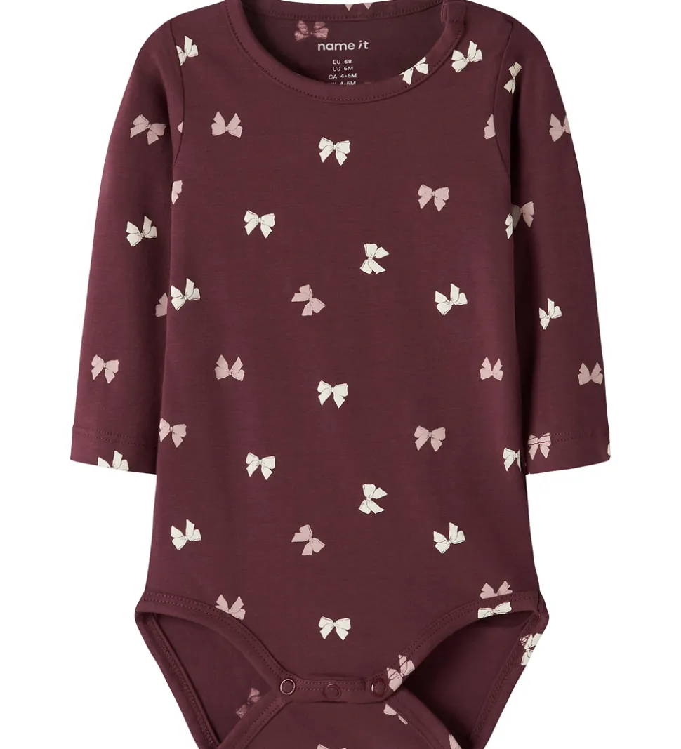 Charmerende Name It body med lange ærmer i en dyb bordeaux farve med et dekorativt print af små, rosa sløjfer. Bodyen har en fin rund halsudskæring og lukkes praktisk med trykknapper i bunden samt ved venstre skulder. De lange ærmer og bløde kanter sikrer en behagelig pasform.