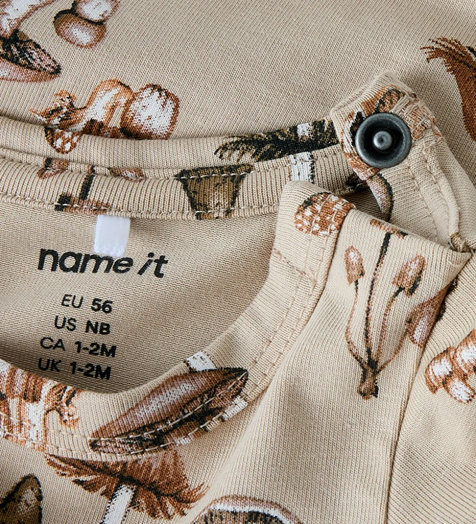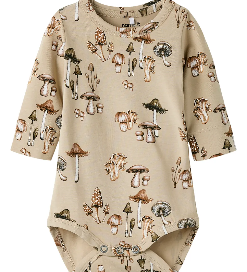 Smart body i beige med et alloverprint af svampe i brune nuancer. Bodyen har en rund halsudskæring med en trykknap ved venstre skulder og lange ærmer. Den lukkes med trykknapper mellem benene.