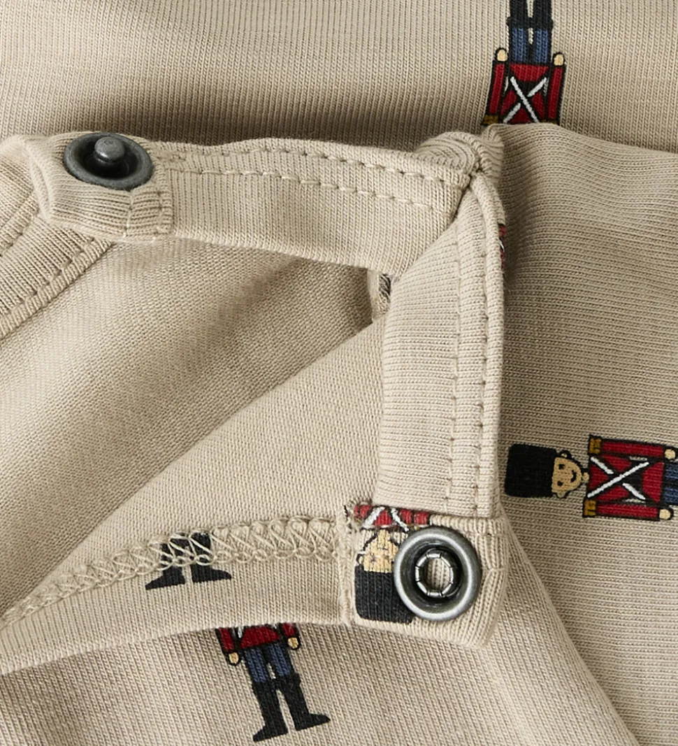 Fin Name It body med lange ærmer i en lys beige nuance. Bodyen er dekoreret med et mønster af små soldater i røde uniformer. Name It bodyen har rund halsudskæring og lukkes med praktiske trykknapper ved venstre skulder samt i bunden.