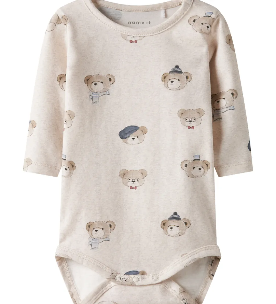 Fin Name It body i meleret beige med et alloverprint af søde bamser med briller og hatte. Bodyen har en rund halsudskæring med trykknapper ved venstre skulder og lange ærmer. Den lukkes mellem benene med trykknapper.