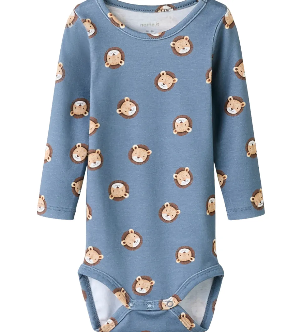 Flot Name It body i blå med et alloverprint af søde løvehoveder. Bodyen har lange ærmer og lukkes med trykknapper ved venstre skulder samt mellem benene.