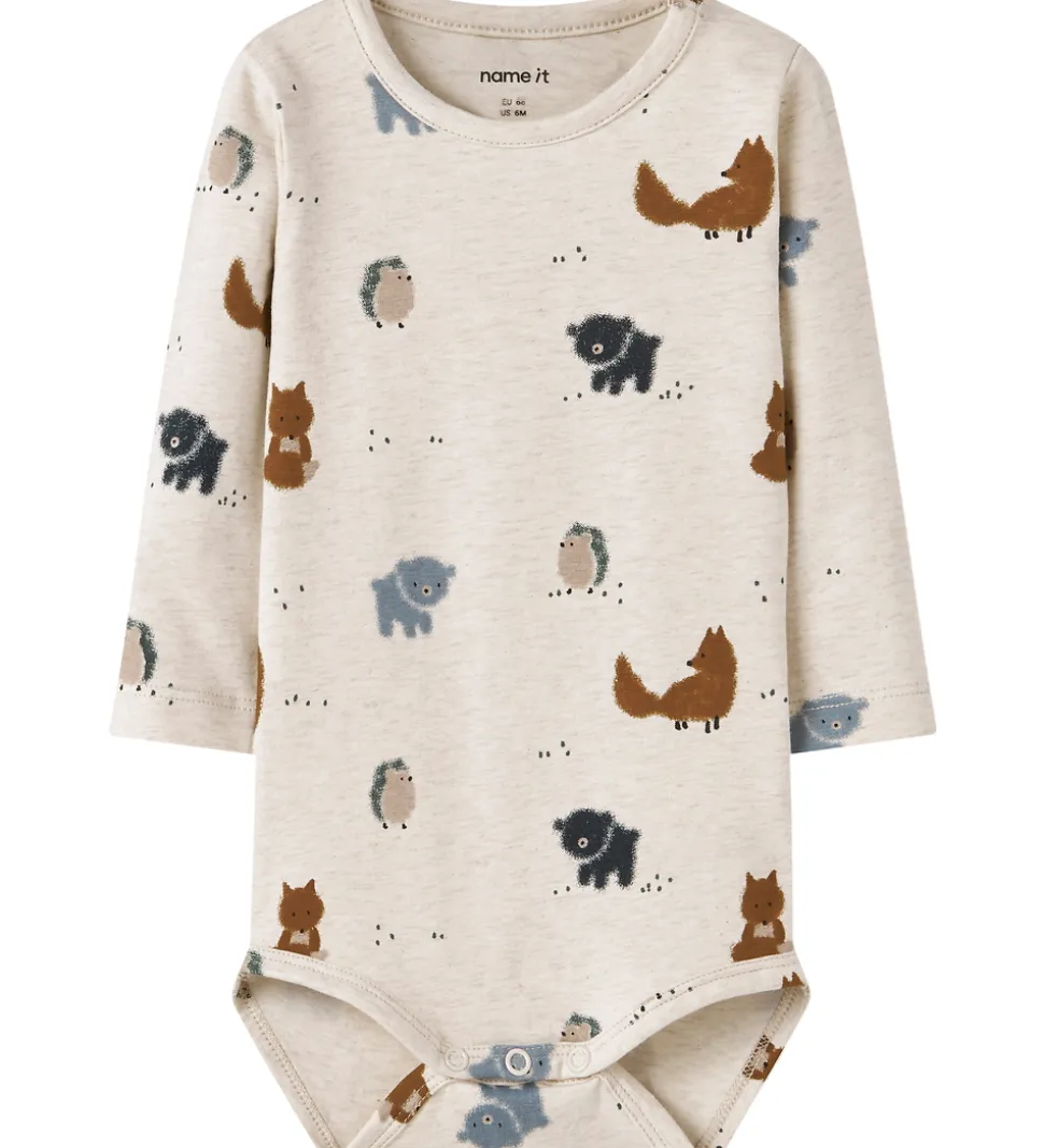 Fin Name It body i lys, meleret beige med dyreprint. Name It bodyen har en rund halsudskæring med en trykknap ved venstre skulder og lange ærmer. Den lukkes med trykknapper mellem benene.