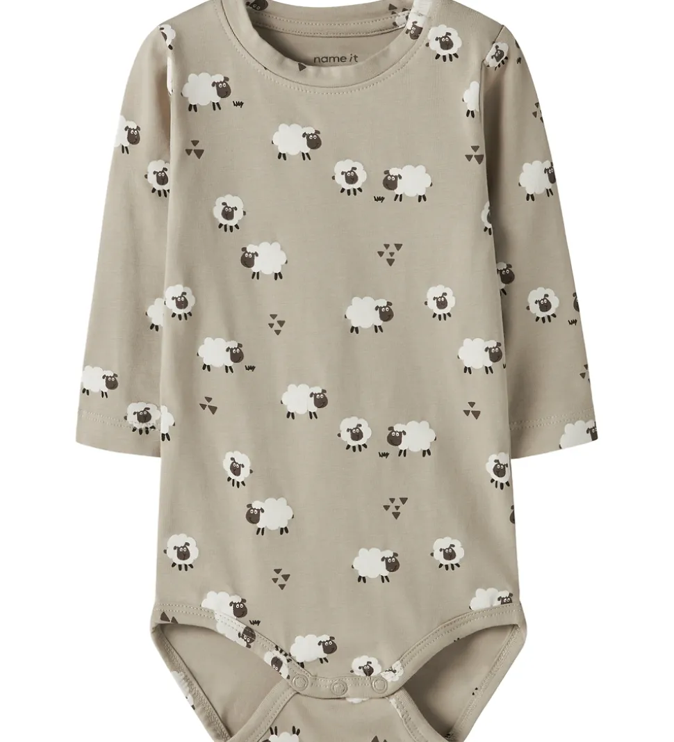 Charmerende Name It body med lange ærmer i en lysebrun nuance. Bodyen er dekoreret med et skønt får-print, som gentager sig over det hele og tilføjer et legende element til designet.