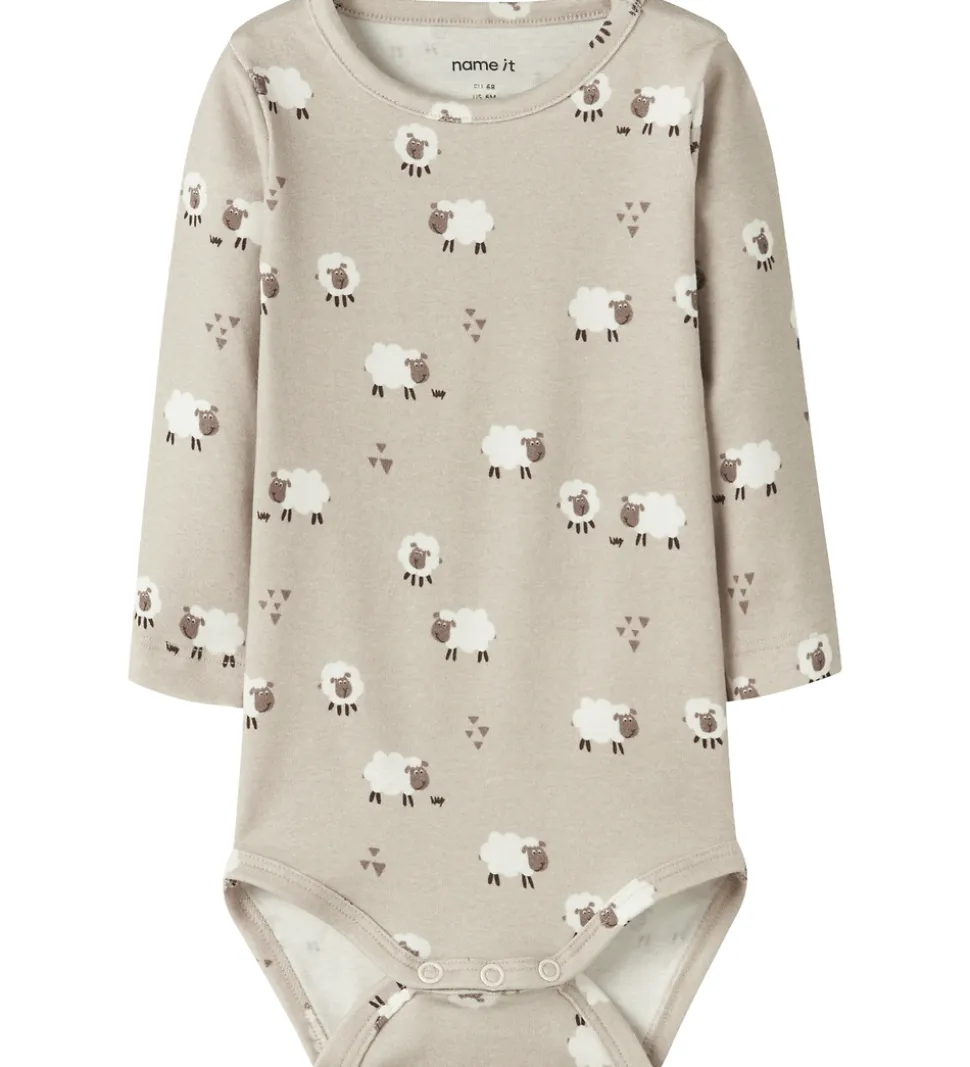 Sød Name It body i beige med et alloverprint af får. Bodyen har en rund halsudskæring med trykknapper ved venstre skulder og lange ærmer. Den lukkes mellem benene med trykknapper.